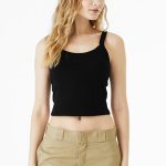 Stretch fit Scoop neck 1×1 micro rib Side seamed Mid-length Tear-away label 5.4-ounce, 52/48 Airlume combed and ring spun cotton/polyester, 32 singles Athletic Heather: 90/10 Airlume combed and ring spun cotton/polyester