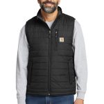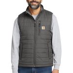 When it’s just cold enough to call for core warmth, this insulated vest has you covered as a lightweight, water-repellent layer. 1.75-ounce, 100% nylon Cordura ® shell Rain Defender ® durable water repellent Wind Fighter ® technology tames wind Nylon lining quilted to 100-gram, 100% polyester insulation for warmth Reverse coil center front zipper Zip-through collar Left chest map pocket with reverse coil zipper Two hand pockets with hidden snap closures Two interior pockets: one zippered, one hook and loop closure Drawcord adjustable drop tail hem Carhartt-strong, triple-stitched main seams Carhartt label sewn on chest pocket Relaxed fit