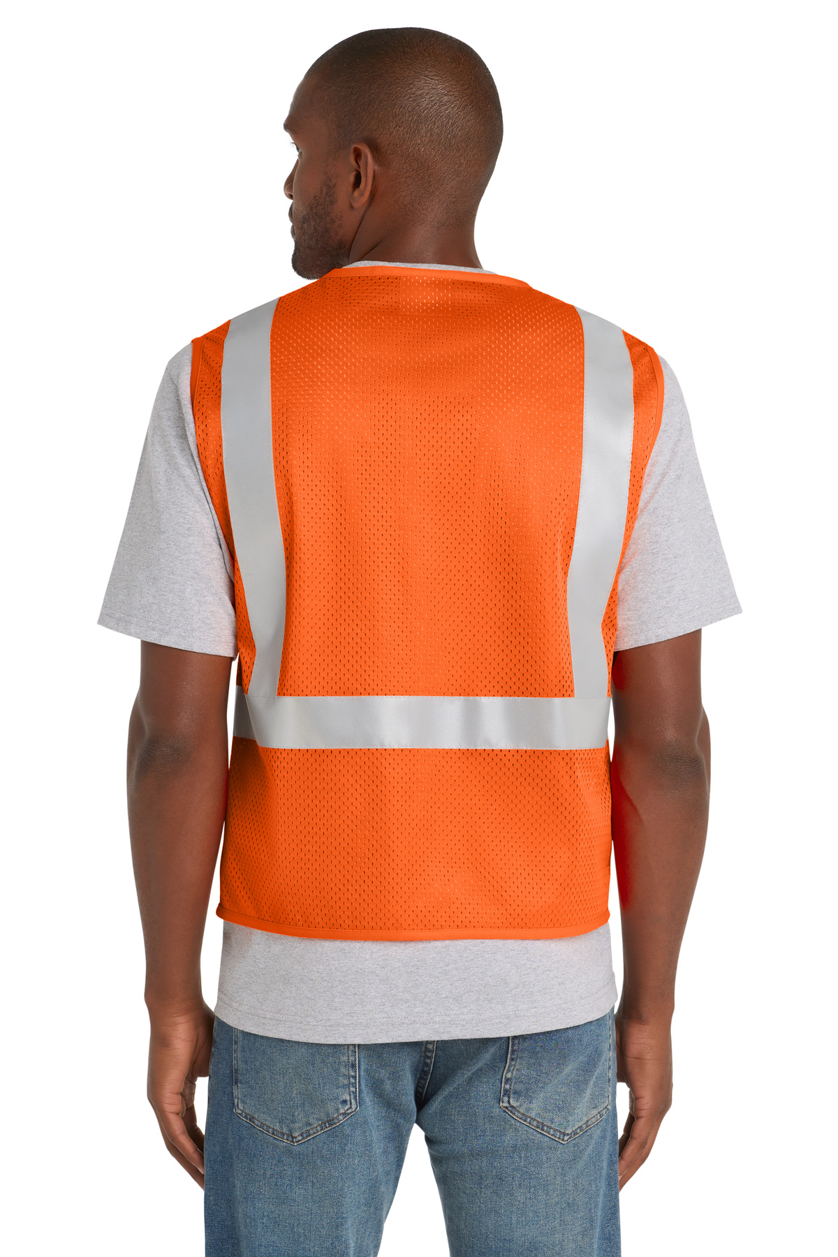 This breathable vest features jobsite must-haves like four storage pockets and a mic clip. 100% polyester mesh for breathability Durable, reflective 2-inch tape meets ANSI 107 requirements and provides 360-degree visibility on body Left chest mesh pocket for essentials Two layered mesh interior right chest pockets: one is divided into four equal parts to separate implements Interior lower left mesh pocket for additional storage Mic clip at left chest for easy access Molded center front zipper closure This garment must be fully zipped to be in compliance with ANSI 107 standards