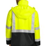 This lightweight jacket is jobsite-ready, provides protection against the rain and meets the highest class of visibility. 100% polyester oxford with water-resistant finish Black bottom front and lower sleeves for a cleaner appearance Fully seam sealed 3-panel hood that stows in collar Durable, reflective 2-inch tape meets ANSI 107 requirements and provides 360-degree visibility on body and sleeves Full-length exterior storm flap with snap closure Adjustable cuffs with hook and loop closures Two lower front pockets with flaps Adjustable drawcord hem This garment must be fully zipped to be in compliance with ANSI 107 standards