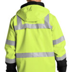 100% polyester 300-denier ripstop shell with durable water-repellent (DWR) finish 100% polyester lining Black bottom front and lower sleeves for a cleaner appearance Shell’s fabric waterproof rating: 5000MM Fully seam-sealed shell Adjustable rain hood Durable, reflective 2-inch tape meets ANSI 107 requirements Full-length interior and exterior storm flaps Vented cape back Right chest pocket and retractable ID holder Two lower front pockets Center front zippered pocket to hold a tablet Gusseted cuffs Elastic hem Decoration access pocket in shell Non-ANSI, 8.6-ounce, 100% polyester inner full-zip hoodie Hoodie can be attached inside shell This garment must be fully zipped to be in compliance with ANSI 107 standards