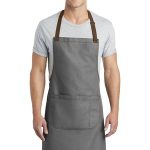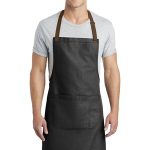 Craftsman styling creates a signature look in this apron that¿s perfect for bistros, pubs, cooking classes and more. The wrinkle-resistant fabric has a denim-like look which blends performance with style to make a sophisticated statement. 7-ounce, 60/40 cotton/poly yarn-dyed twill Adjustable contrast webbing neck strap with antique-finish metal slider Patch pocket, pen pocket Self-fabric waist ties Contrast stitch details Measures: 25’w x 34.5’l
