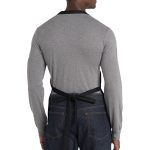 This versatile apron offers stain-release protection. | 7-ounce, 100% cotton twill with stain-release protection Three pouch pockets, pen pocket 1-inch wide neck and waist ties, adjustable neck strap Measures 22’w x 24’l