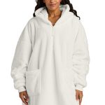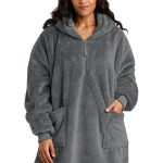 This two-sided brushed fleece poncho is simply fluffy and fun. Perfect for lounging, it offers a warm retreat any time of year. 7.9-ounce, 100% polyester fleece 1/2-zip popover style Generous hood Rib knit cuffs Patch pockets Drop tail hem Oversized fit