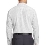 This hardworking IL50 style has a professional stripe and is tested through 50 industrial launderer washes. | 4.25-ounce, 65/35 poly/cotton with Touchtex™ technology for superior color retention, stain release and wickability Yarn-dyed fabric Open collar with sewn-in stays 7 buttons including button at neck Two button-through pockets Bartacked pencil stall on left pocket